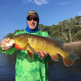 5.134 peacock bass landed last week by our 34 visiting anglers, plus an assortment of other species including massive aruanás, graceful trairas, aggressive black piranhas, etc.