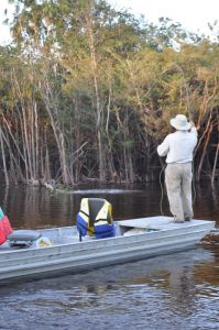 Novice peacock anglers tend to set the hook too fast when fishing topwater lures or flies. Often peacocks will just slap at the lure to stun it and then come back around and firmly grab it on the second pass. It’s hard to remember at first, but don’t set the hook on the strike. If you can’t see the plug or fly after about three seconds, drop your rod tip and set the hook as hard as you can. Big peacocks have very tough skin around their mouths and tend to grip the plug or fly firmly.