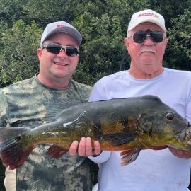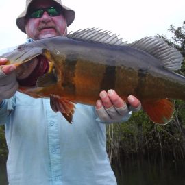 Xeruini in Dry-Zone N. East -: Last week the Coszby Jr. group of 7 anglers finished the week with over 700 landed peacock bass, though no trophies were reported. Water levels continue to be a bit high but very fishable and dropping. Weather forecast shows no significant rain episodes in the coming days. Fishing conditions continue to improve daily (pls. see below). The Powers group arriving last Saturday had a nice start landing over 150 peacock bass, though no trophies have been reported yet. Branco lakes in Dry-Zone N. East -: Last Saturday we received the Lawson group at our camp IV now in the Omero and the Shoy group at our camp III at the Branco lakes, both of 8 anglers. Both groups had a great start landing over 400 peacock bass each plus a varied mix in the basket including aruanas, trairas, matrinxas, bicudas, etc. Forecast promises is uniform in the area showing some insignificant rain episodes towards the weekend. Itapará in Dry-Zone N. East -: Last week the Silvara group landed over 400 peacock bass with 7 trophies from 17 labs to 20 lbs.. This week´s basket for the Warfield group already includes 3 trophies above the 17 lbs mark. Water levels on this fishery keep dropping towards their optimum level and are very fishable. Fishing conditions for the next days according to the forecasts are excellent with only some mild rain towards the weekend (pls. see below)