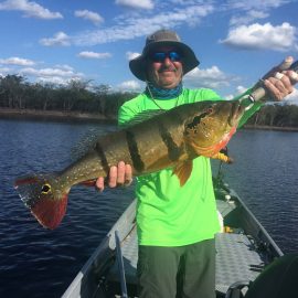 Last Saturday we received the Dick group a our Marmelos private fishery, and they had an excellent start landing 627 peacock bass and also 4 beautiful pirararas (red tails). Last week´s group ended the week with a total count of 1.141 peacock bass and until now the largest one weighed 17lbs.
