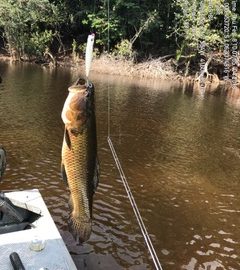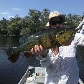 Last weekend at our Itapará private fishery, several trophies above the 17lbs benchmark were caught and released, with the (up to now) season record of 24lbs.. Simultaneously the Jufaris and Xeruini produced plenty of  graceful aruanás, massive arapaimas, and several other species supplementing the peacock bass tally and enhancing the blissful experience. Fishing conditions are good, no rain during the weekend and forecasts show no significant rain for the rest of the week in our fisheries.