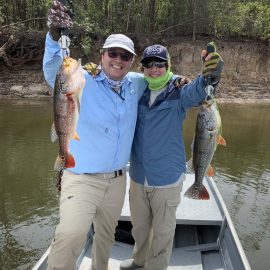 Matupiri fishery in Dry-Zone S. West -: Last Saturday we received the Trask group of 6 anglers in our Floating cabins fishing the mid Matupiri; Stephen Trask and Robert Page are visiting our operations yet one more time, and intend to do some exploratory trips in surrounding rivers. They enjoyed good weather conditions, their fish count was 413 landed peacock bass. Rain forecast is good and dropping tendency is expected to continue. Last week the Bell group anglers landed 1.061 peacock bass in the week largest of which weighed 16lbs. Roçado fishery in Dry-Zone N. West -: This fishery continues in standby status this week. Water levels resumed the dropping tendency, forecast is good and river is under permanent monitoring, it is expected to resume operations in the coming weeks (likely Nov 09). Omero lakes in Dry-Zone N. East -: This weekend we received the Bilberry group of 7 anglers, who enjoyed excellent fishing conditions landing 387 peacock bass in just 2 1/2 days within a mixed bag that included beautiful aruanas, cachorra, piranha, jacunda, cara-açu, traíra, pirara and pirapitinga. Best performing lures are perversas as reported by camp.Last week the Key group had an excellent tally with 1.692 landed peacocks, largest of which weighed 18lbs and within a mixed bag of species including aruanas, pirarucus, etc. Fine weather and good water levels expected in the coming days. Upper Itapará fishery in Dry-Zone N. East -: Breaking water at our traditional fishery in the Upper Itapará, this weekend we received James Cahill III and Tracy Love visiting us once again, who had a challenging start with water levels a bit on the high side, but fishable. Weather conditions will be good for the rest of the week, and fishery is expected to improve conditions in the coming dates, camp will move as far towards the fountain head as the jungle allows them. Upper Jufaris fishery in Dry-Zone N. East -: Breaking water also at fishery in the Upper Jufaris, this weekend we received Eben and Aaron Huston one more time in this fishery, who had a challenging start enduring some heavy rain episodes and with water levels a bit on the high side, but very fishable, landing a couple of trophies, largest of which exceeded the 20lbs mark.. Weather conditions will be good for the rest of the week, and water levels are expected to keep dropping tendency.