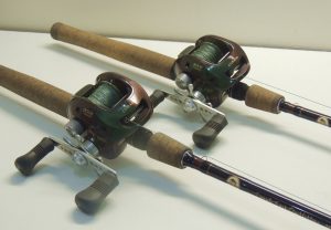 2 – 6’6″ medium-heavy baitcasting rod with a Shimano Curado 300 loaded with 80 lb. braided line.