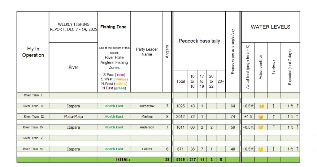 Week 23 was a typical 45-60 peacocks a day per boat, with tallies occasionally going up to 120 fish for avid fishermen with 231 peacocks a week over 10 pounds, 14 over 16 pounds ,and 3 anglers landed fish over 20 lbs. Even with high water levels across most basins, River Plate refused as always to stand still. We ventured over 300 river miles to reach the lowest fishable stretches within our 14 private rivers. Along the way, our four parties caught a total of 5319 peacocks while crafting lifetime unforgettable adventures.