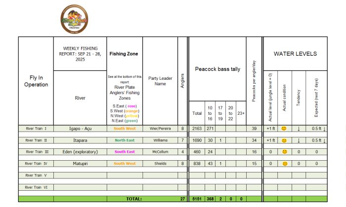 Two long-time-repeating parties of 8 anglers, the Wiers from Texas and the Shields from Arkansas, on the Igapo-açu and Matupiri tribal reservation. And, the Williams party on the Itapara river. They fished a total of 5151 peacocks with 368 over 10 lbs; 133 over 14 lbs and two 19 lbs trophies.